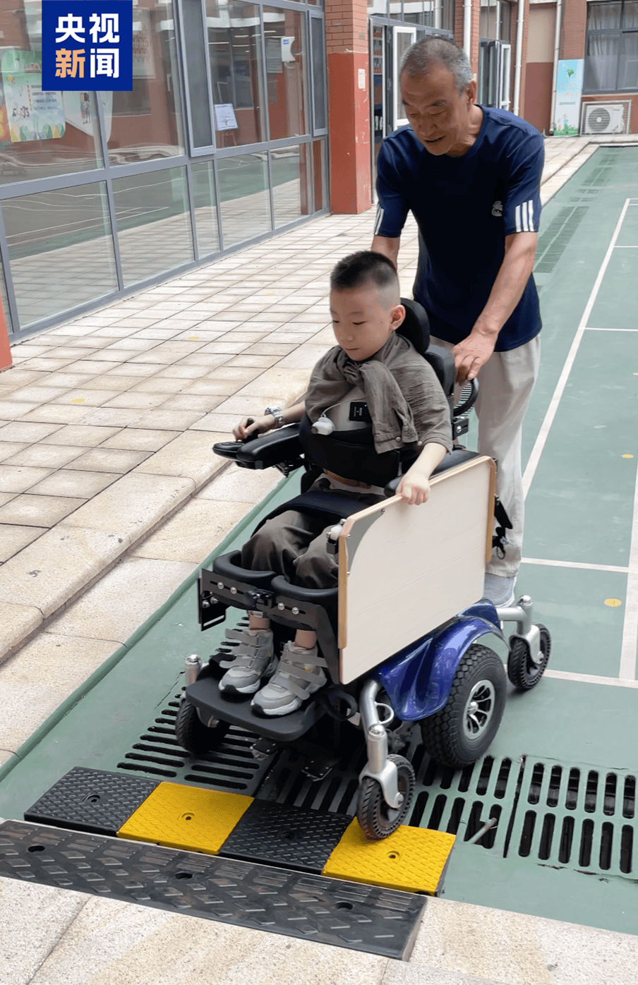 一年级的教室位于教学楼一层,进出都有台阶,学校特意增加了无障碍坡道设施。通过操作电动轮椅,小石头可以自行前往教学楼或操场。