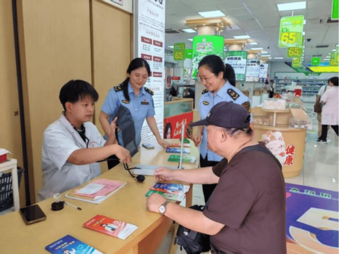 清名桥二分局充分利用辖区内药店电子屏滚动播放宣传海报,并在市民大药房朝阳店民生药事驿站设立宣传点。针对朝阳市场周边药店密集、老年购药人群较多的特点,工作人员重点讲解常见用药误区,如擅自调整药量、中药煎煮规范、抗过敏药合理使用等,有效提升居民科学用药素养。